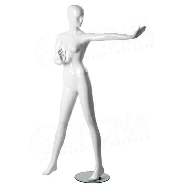 Abstraktní bílá lesklá stojící figurína se skleněným podstavcem je hitem současné módy.