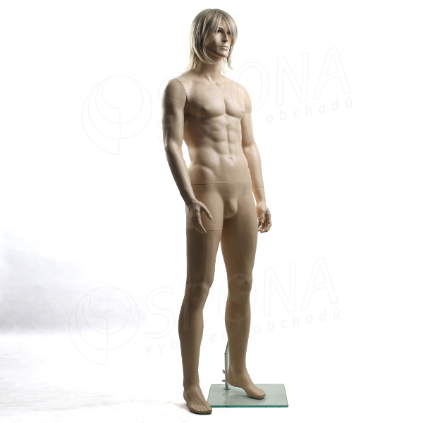 Stojící figurína urostlého muže v tělové barvě bez paruky včetně skleněného podstavce.