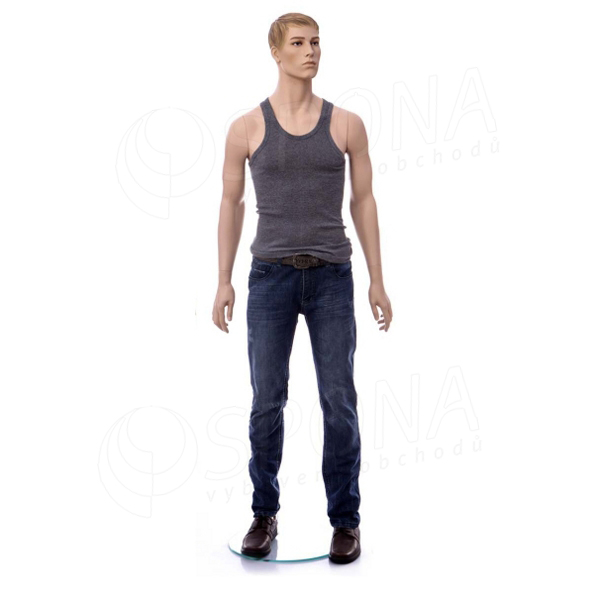 Dokonalá stojící mužská postava v tělové barvě s prolisovanými vlasy, se skleněným podstavcem.