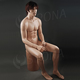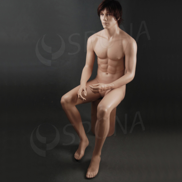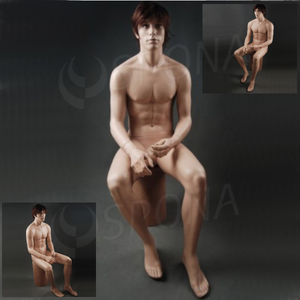 Kvalitní sedící pánská figurína v tělové barvě bez paruky, včetně sedáku.