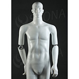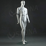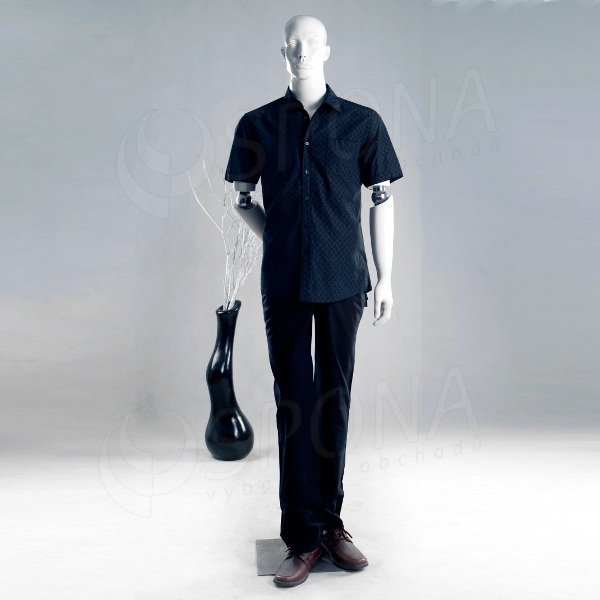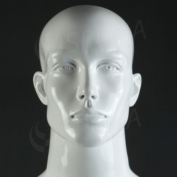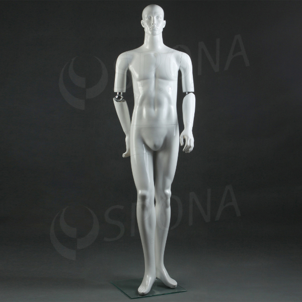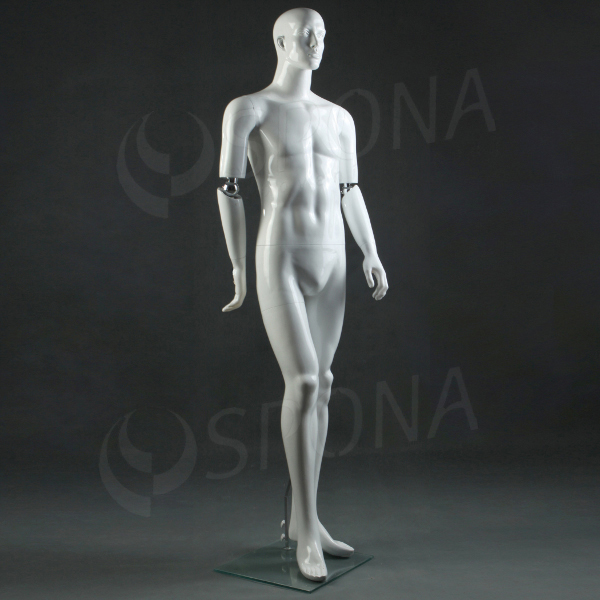 Abstraktní bílá lesklá stojící figurína se skleněným podstavcem je hitem současné módy. Polohovací ruce pomocí kloubů v loktech